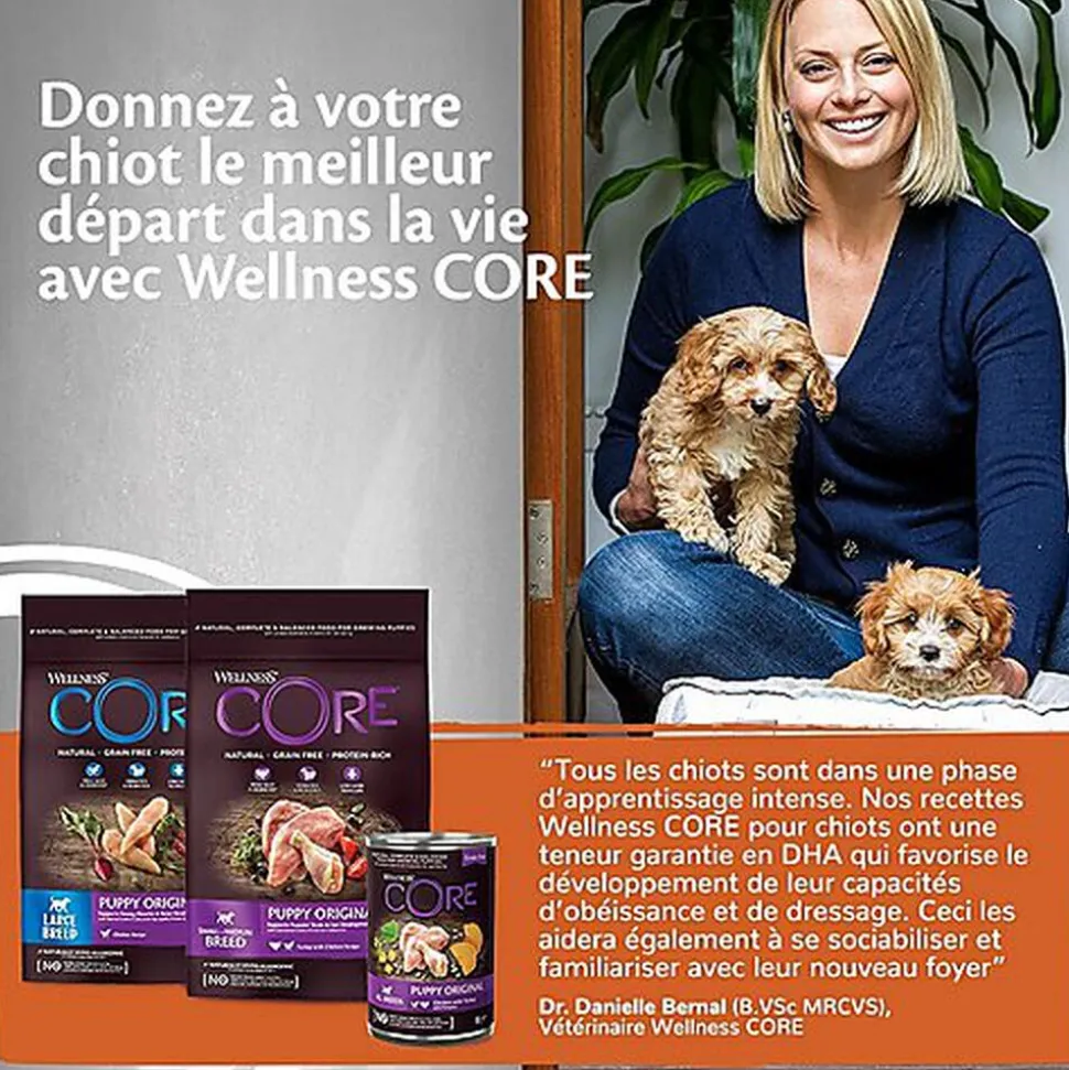 | Constituants analytiques | Protéine 10,4%, Teneur en matières grasses 5,6%, Fibres brutes 0,6%, Cendres brutes 2,2%, Humidité 80,0%, Acide docosahexaénoïque (DHA) 0,05 %.Wellness CORE Puppy Original est un aliment complet pour tous les chiots en pleine croissance. » |
