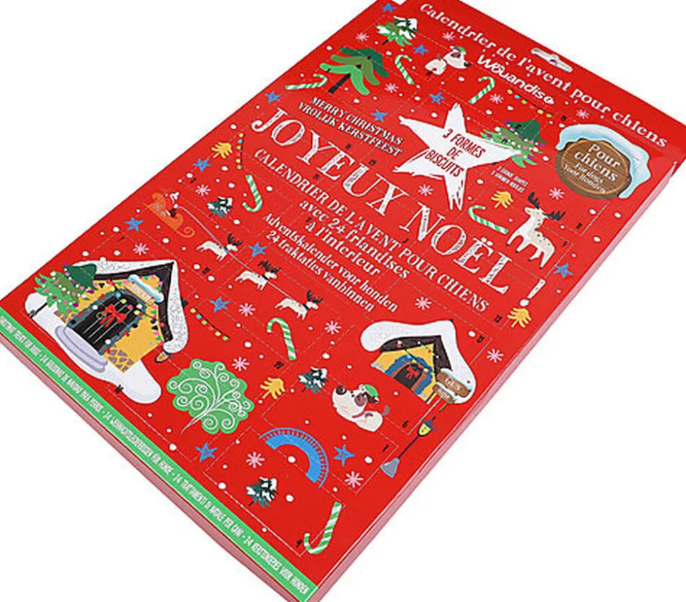 Calendrier de l’Avent pour chiens avec 3 sortes de biscuits différentes à l’intérieur. 24 friandises à découvrir petit à petit en ouvrant une case par jour du 1er au 24 décembre.