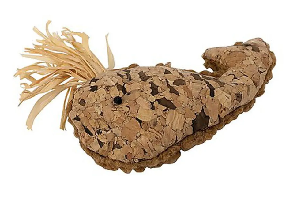 Jouet pour chat en forme de baleine en liège avec tissus, pour de longues heures de jeu.