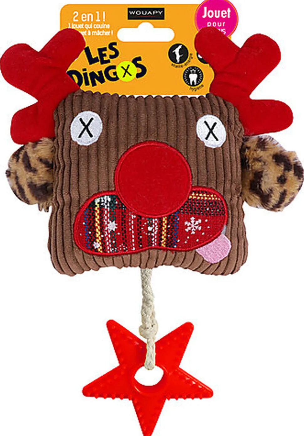 Jouet pour chien en tissu avec un sabot de veau séché 100% naturel, fixé grâce à une cordelette. Ce jouet couine lorsque le chien le mordille, pour occuper les chiens pendant des heures.
