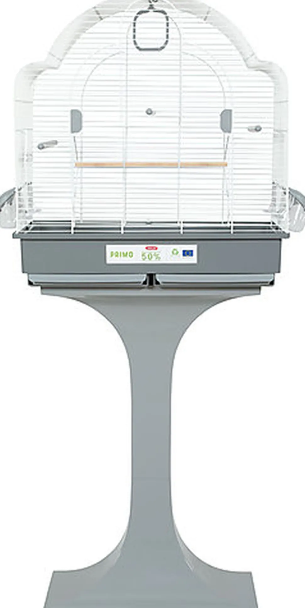 Nouvelle cage éco-conçue PRIMO Caly sur pied pour oiseaux domestiques avec bac en plastique 50% recyclé. Elle s’intègrera facilement dans les intérieurs grâce à ses coloris classiques et actuels gris clair et blanc.
